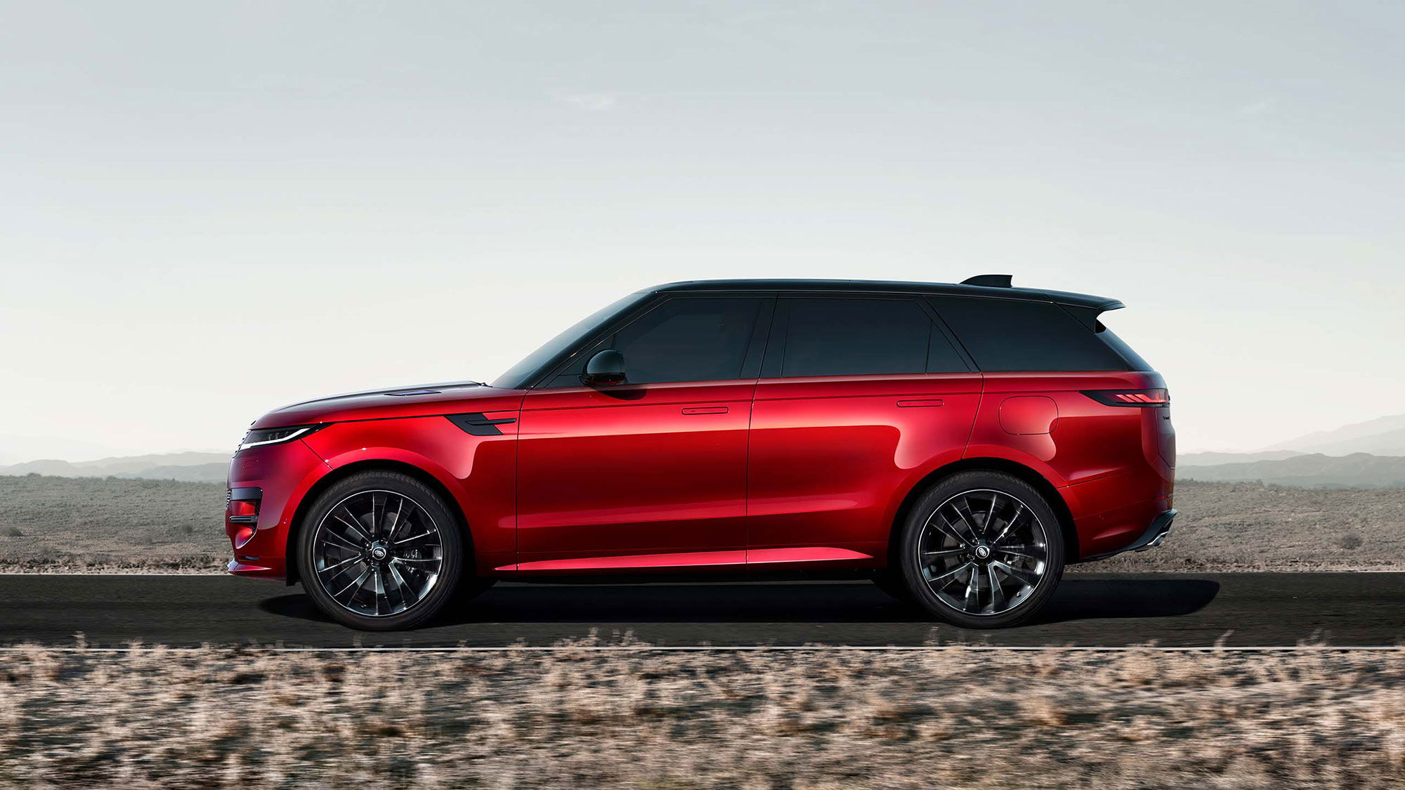 New Range Rover Sport’s imposing road presence is derived from its muscular stance, dramatic proportions and short overhangs. 23” wheels in a range of finishes are available. The vehicle’s profile is unmistakable.